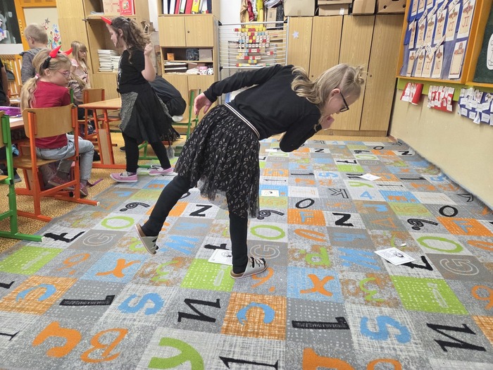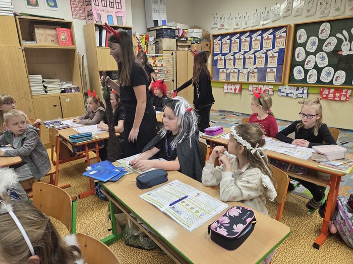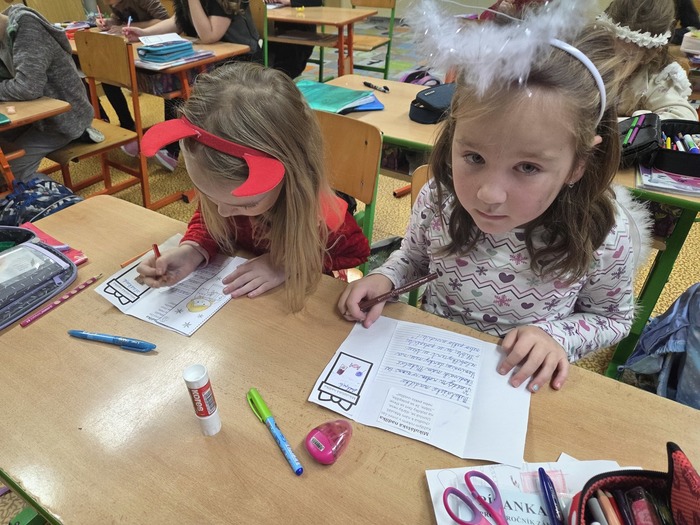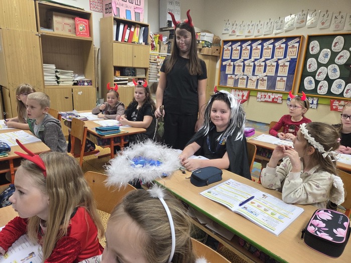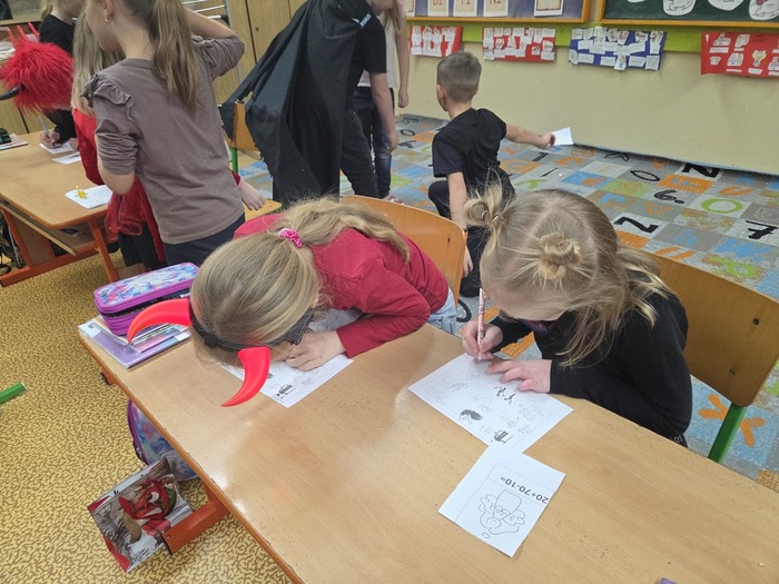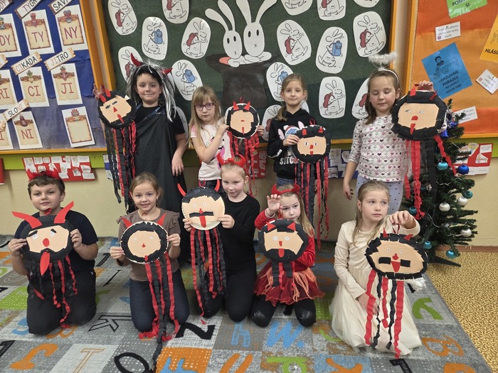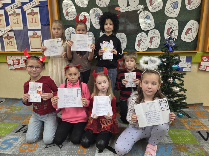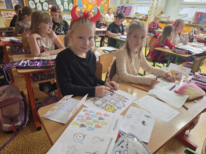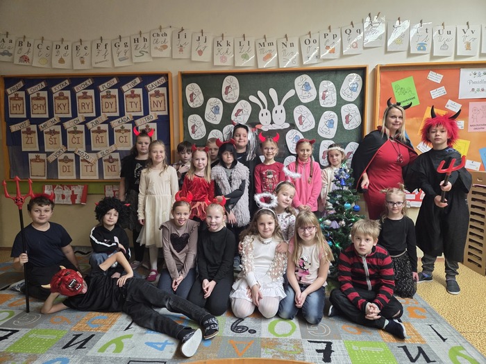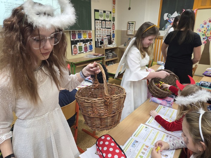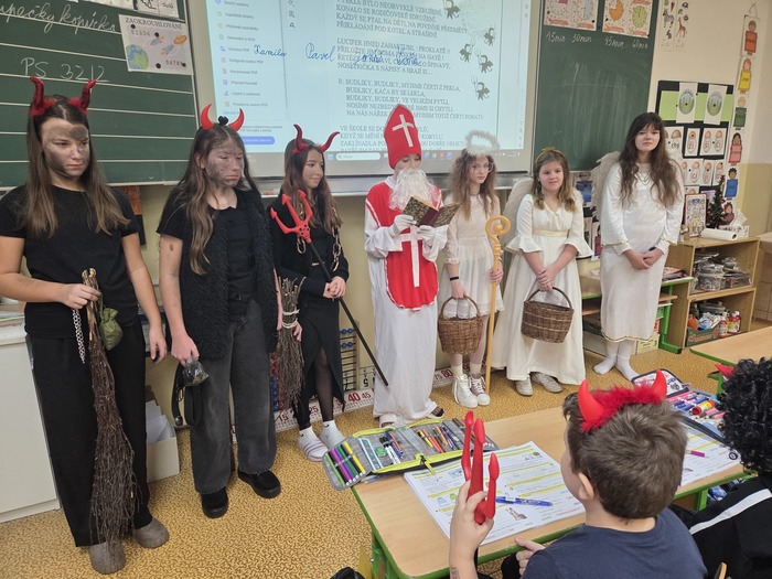 V 2. A jsme si užili zábavné čertovské učení. Do třídy zavítali čerti spolu s anděly a Mikulášem, kterému děti zazpívaly písničku Budliky, budliky. Za svůj pěkný zpěv si vysloužily sladkou odměnu. Následovaly úkoly a učení na čertovské téma, které vytvořily příjemnou, veselou atmosféru a proměnily celé dopoledne v radostný zážitek.