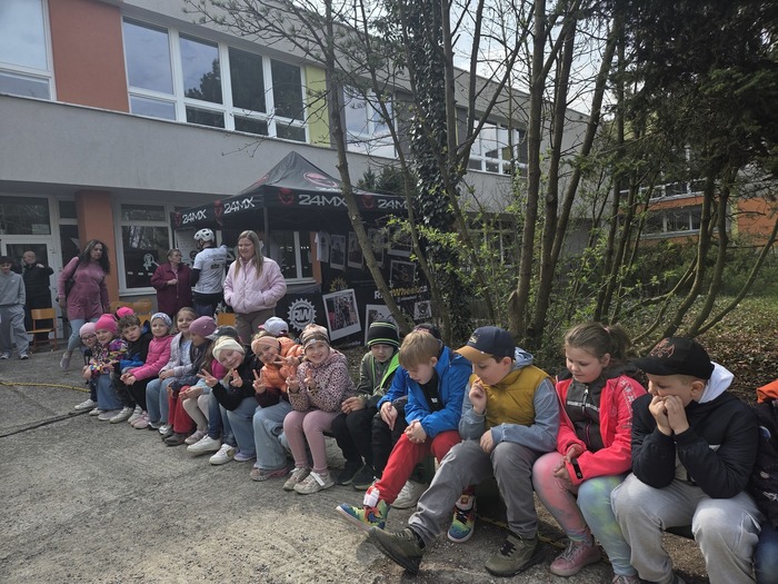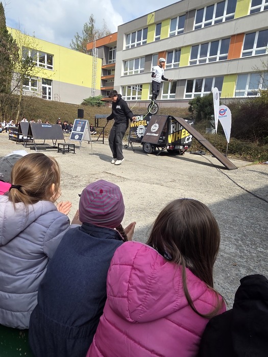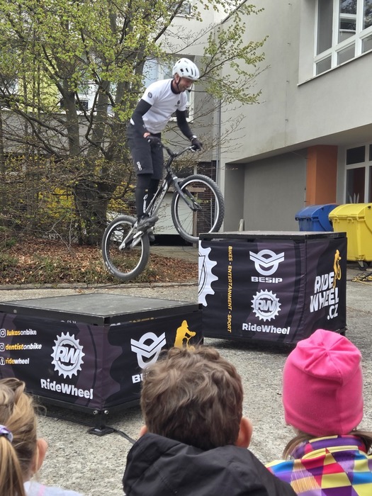 Ukázky jízdy na kole předvedl jeden jezdec, který nám ukázal různé triky a dovednosti. Dětem se nejvíce líbilo, když jezdec skákal přes učitele, což byl velmi napínavý okamžik. Akce byla poučná i zábavná a všem se moc líbila.