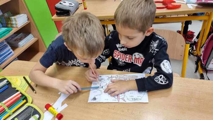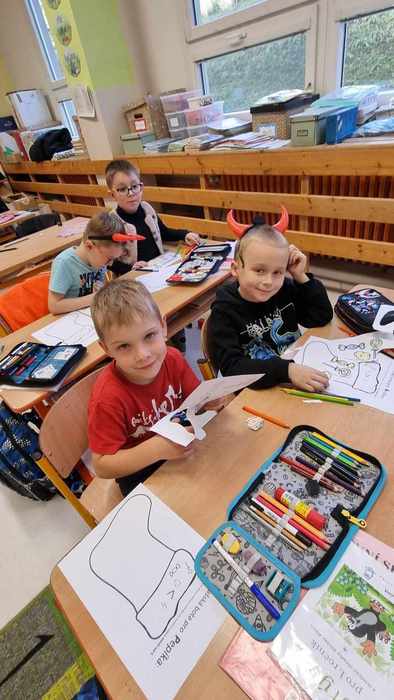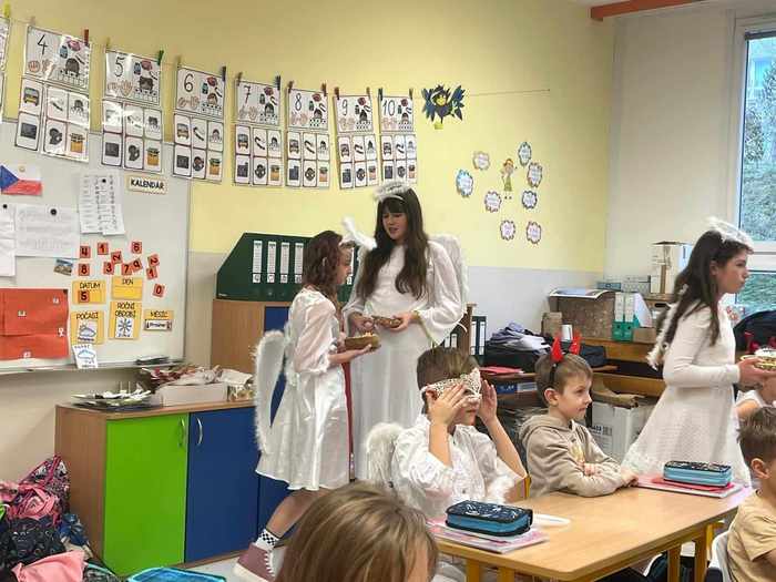 Naše čertí škola začala pravou čertovskou honičkou v tělocvičně. Čertíci dováděli, chytali se za ocas, házeli po sobě uhlí a vyváděli všelijaké další čertoviny. Potom je ve třídě navštívila skupina andělů a čertů v čele s Mikulášem. Prvňáčci jim zazpívali písničku, řekli básničku a za odměnu dostali bonbon. Pak je čekalo plnění úkolů ve dvojicích, se kterými si hravě poradili.