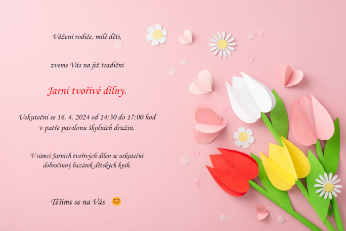 V úterý 16. dubna 2024 se budou v době od 14.30 do 17.00 konat Jarní tvořivé dílny.  Součástí bude stejně jako loni dobročinný bazárek knih. Srdečně zveme všechny děti a jejich rodiče na tuto akci