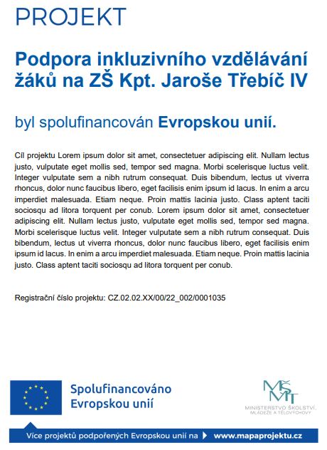 Škola realizuje od 1. 9. 2022 do 31. 12. 2024 projekt "Podpora inkluzivního vzdělávání žáků na ZŠ Kpt. Jaroše Třebíč IV" (reg. č.: CZ.02.02.XX/…035) v rámci výzvy Šablony pro MŠ a ZŠ I Operačního programu Jan Amos Komenský - projekty zjednodušeného vykazování. Z dotace projektu ve výši 2.549.787 Kč jsou hrazeny - pracovní pozice speciálního pedagoga a vzdělávací akce pro pedagogické pracovníky.